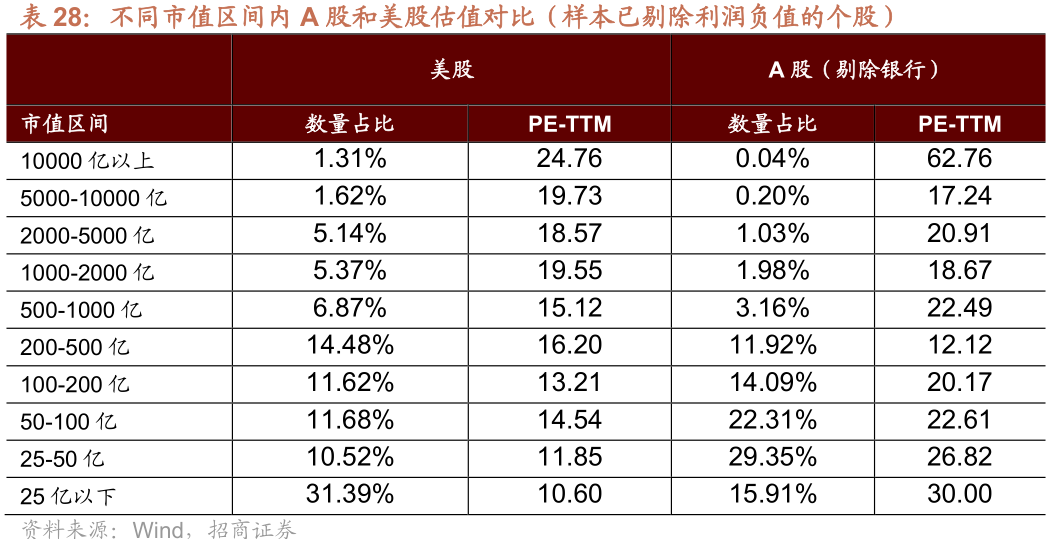 中美股票市场不同市值区间的估值水平存在明显差异。比较不同市值的估值水平发现,美股市场上估值和市值呈现一定的正相关关系,市值较大的公司往往能够获得更高的估值溢价,而市值较小的公司难以得到投资者的关注,其估值水平也较低;在相对健全的股市规则和机制下,美股市场上公司的进入和退出频率较高,为整个股市营造了更加健康的生态体系,即更多的资金流入经营业绩良好的企业并且形成良性循环,而基本面较差的企业越来越难以达到资金的青睐并导致估值进一步下行。而在A股市场上,市值与估值没有特别明显规律,但极小市值企业(50亿元以下)对应的整体估值水平明显偏高;不过近期极大市值公司(10000亿以上)估值则是出现提升,说明A股市场景气度较高且业绩水平较好的公司所享受到的资金青睐程度和估值溢价已经出现明显提升。