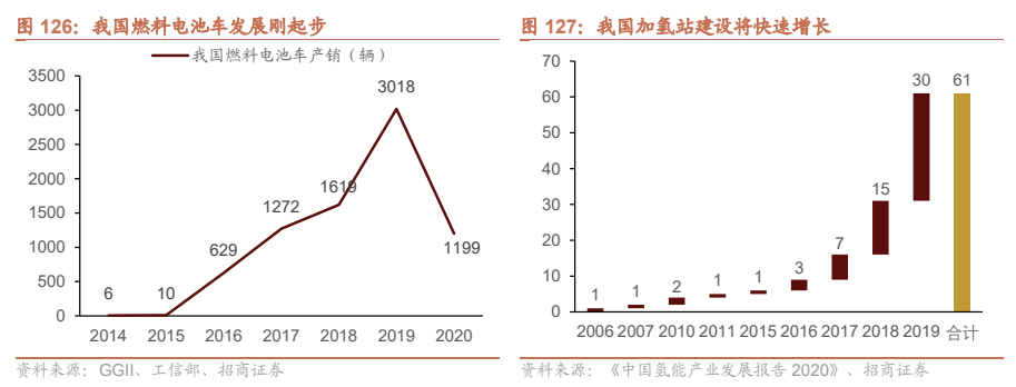我国尚处于燃料电池车发展初期,示范城市政策推动下产业化有望提速。当前,我国氢燃料电池车的发展仍处于初期,每年的产销量仍在千辆级别。今年,上海、北京等地已经获得氢燃料电池示范城市,氢燃料车的发展将进入快车道。与此同时,当前加氢站的建设也较为不足,预计将与氢燃料电池同步建设发展。