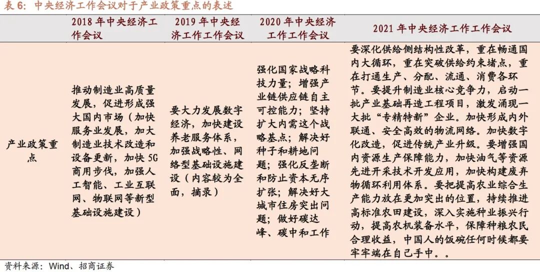 2018年、2019年底的中央经济工作会议中产业政策中,对于偏信息科技领域做了更多的表述,2019~2020年上半年,信息科技板块表现还是相当优秀;2020年的产业政策中,对于“增强产业链供应链自主可控能力”,“做好碳达峰、碳中和工作”做出了相当详细的描述,尤其是“双碳”成为了2021年的行业选择主线。而今年的中央经济工作会议,对于特定的产业领域没有做出具体的表述,更多的是强调提高制造业“效率”。