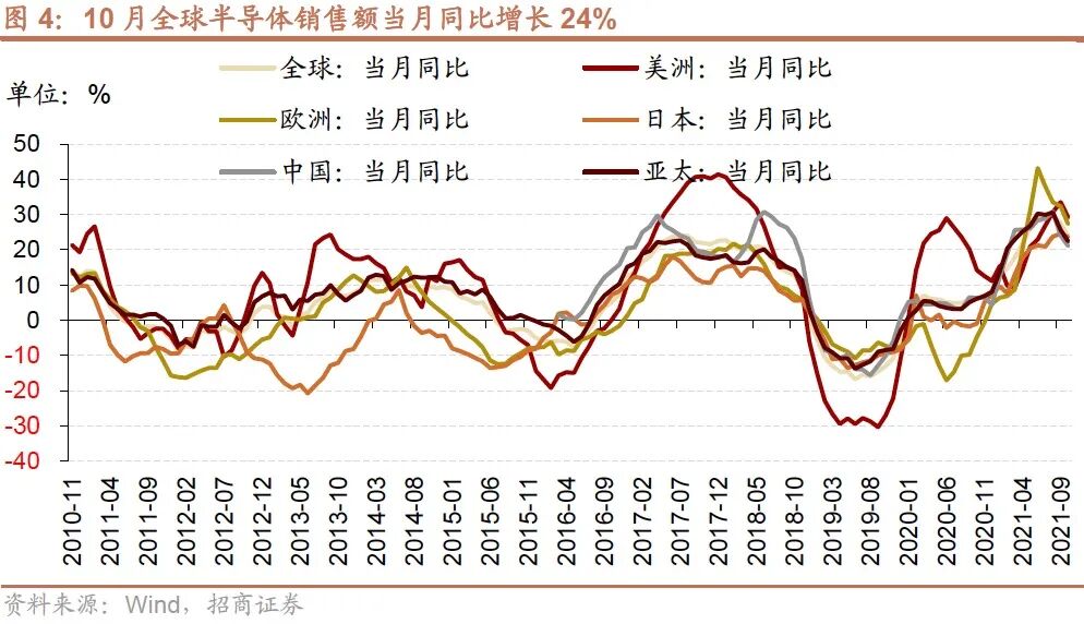 10月全球半导体销售额同比增幅收窄,美洲、日本、欧洲、中国和亚太地区销量同比增幅均收窄。根据美国半导体产业协会统计数据,10月全球半导体当月销售额为487.9亿美元,同比上行24%,较9月份涨幅收窄3.6个百分点,但是仍然处于较高增速。从细分地区来看,美洲半导体销售额为109.8亿美元,同比增长29.2%,较9月涨幅收窄4.3个百分点;欧洲地区半导体销售额为41.2亿美元,同比增长27.3%,涨幅较上月缩小5个百分点;日本半导体销售额为38.6亿美元,同比增长23.7%,涨幅较上月缩小0.8个百分点;中国地区半导体销售额为167.7亿美元,同比增长21.1%,涨幅较上月收窄2.9个百分点;亚太地区半导体销售额为298.2亿美元,同比增长22.4%,涨幅较上月收窄3.2个百分点。