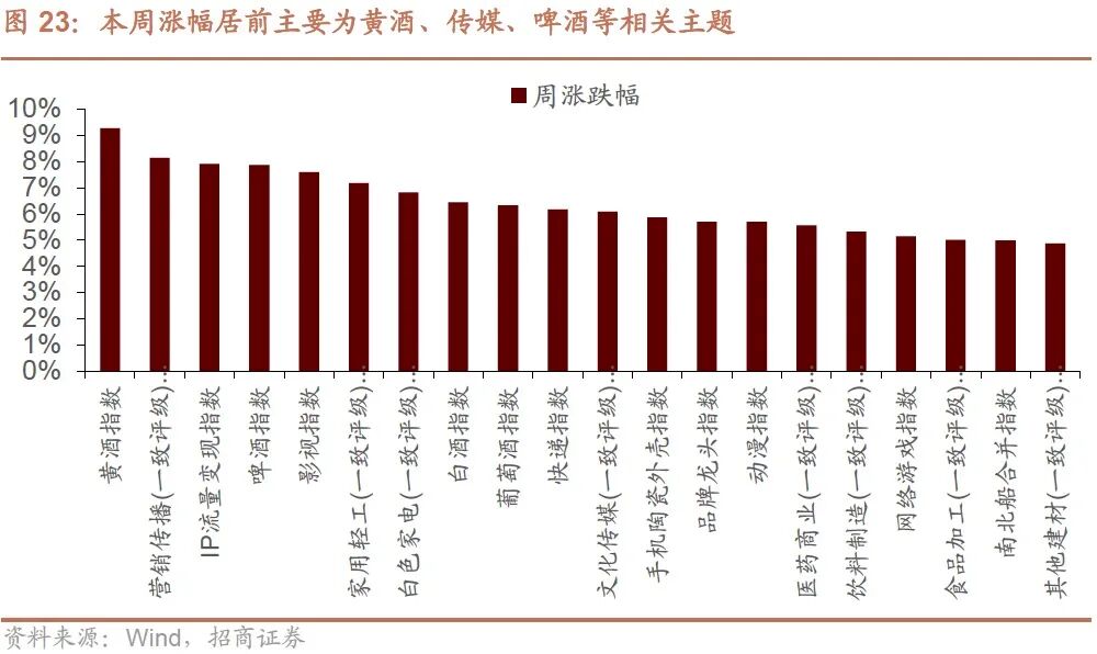 本周市场上涨,Wind全A指数周度上涨1.16%,创业板指下跌0.34%,沪深300上涨3.14%。本周涨幅居前的主要为黄酒、传媒、啤酒等相关主题。