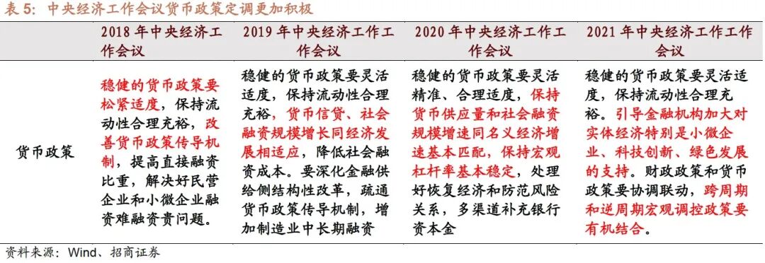 在早些时候的三季度央行货币政策报告中,央行已经没有再提“流动性闸门”,在这次的中央经济工作会议中“保持货币供应量和社会融资规模增速同名义经济增速基本匹配,保持宏观杠杆率基本稳定”类似的表述的也没有再强调,但是也没有类似“引导贷款市场利率下行”,“引导广义货币供应量和社会融资规模增速明显高于去年”等疫情爆发之后,明确宽松的货币政策的信号,说明货币政策已经进入的相机抉择的阶段,可以根据实际经济维持在合理区间的目标灵活调节。财政政策和货币政策要协调联动,跨周期和逆周期宏观调控政策要有机结合。