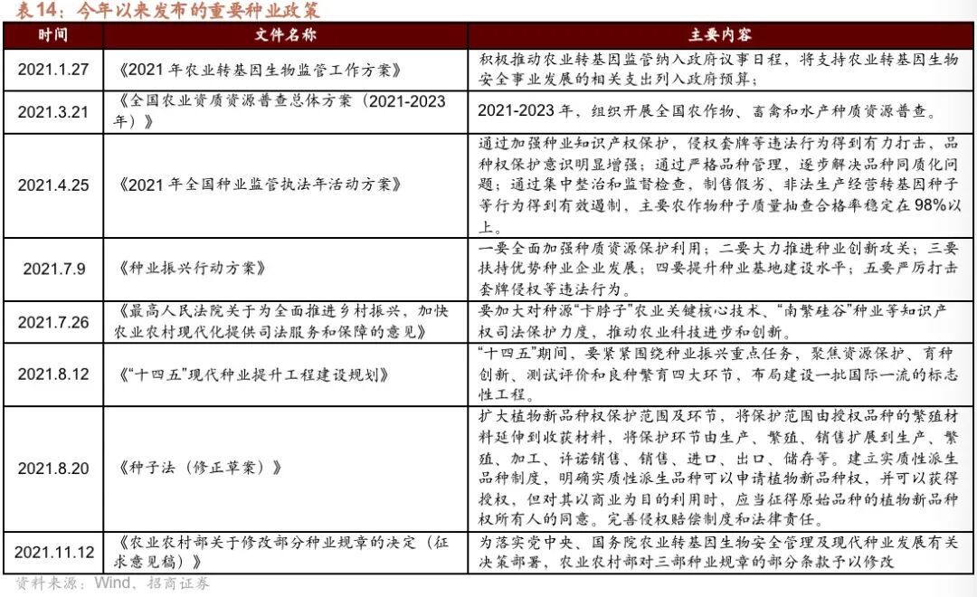今年以来种业政策发布较为密集,政策支持力度加大。7月9日,种业振兴行动方案审议通过,这是继1962年出台《关于加强种子工作的决定》后,再次对种业发展作出的重要部署。8月27日,全国推进种业振兴电视电话会议召开,象征着种业振兴方案进入实施阶段。政策的主要目标包括:全面加强种质资源保护利用、大力推进种业创新攻关、扶持优势种业企业发展、提升种业基地建设水平、严厉打击套牌侵权等违法行为,我们预计种业将迎来更多的政策支持,在加强知识产权保护、培育龙头企业的政策背景下,种业的行业集中度也有望提升