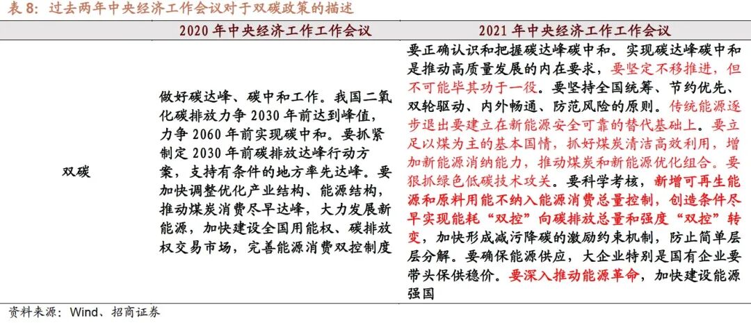 而2021年的中央经济工作会议的七项重点工作内容中,没有单独强调“双碳”而是在七点之外单独论述,而最新的“双碳”目标论述更加客观,“要坚定不移推进,但不可能毕其功于一役”,“传统能源逐步退出要建立在新能源安全可靠的替代基础上”,“增加新能源消纳能力,推动煤炭和新能源优化组合”。