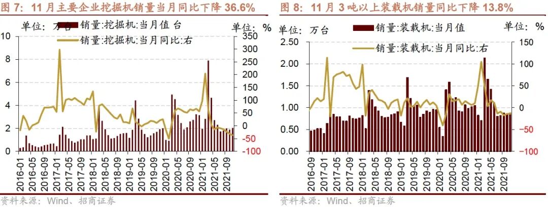 11月份主要企业挖掘机销量同比降幅扩大。根据中国工程机械工业协会统计,2021年11月纳入统计的25家挖掘机制造企业共销售各类挖掘机共20444台,同比下降36.6%(前值-30.6%);2021年1-11月累计销售挖掘机318746台,同比增长7.66%;其中国内258934台,同比下降2.49%;出口59812台,同比增长95.9%。
