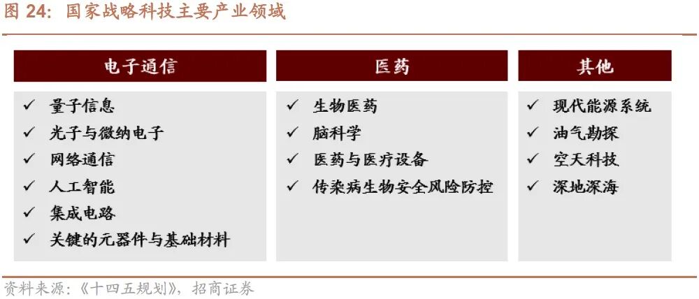 此外,再度强调了国家战略科技。在此前的十四五规划中,国家战略科技也受到了重点关注。这些战略科技力量主要集中在电子通信、医药、能源三大领域,其中电子通信领域主要包括:量子信息、光子与微纳电子、网络通信、人工智能、集成电路、关键的元器件与基础材料,医药领域主要包括:生物医药、脑科学、医药与医疗设备、传染病生物安全风险防控,能源领域主要包括:现代能源系统与油气勘探等,此外还包括空天科技、深地深海。
