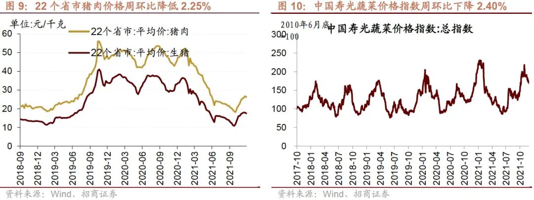 本周仔猪、生猪、猪肉价格环比下降,截至12月10日,22个省市平均仔猪价格30.41元/千克,周环比降低1.33%,22个省平均生猪价格周环比降低2.52%至17.42元/千克,22个省市猪肉价格周环比降低2.25%至26.07元/千克。在生猪养殖利润方面,本周自繁自养生猪养殖利润、外购仔猪的养殖利润有所下降。截至12月10日,自繁自养生猪养殖利润为131.31元/头,较上周利润减少45.8元/头;外购仔猪养殖利润为294.07元/头,较上周利润减少32.4元/头。