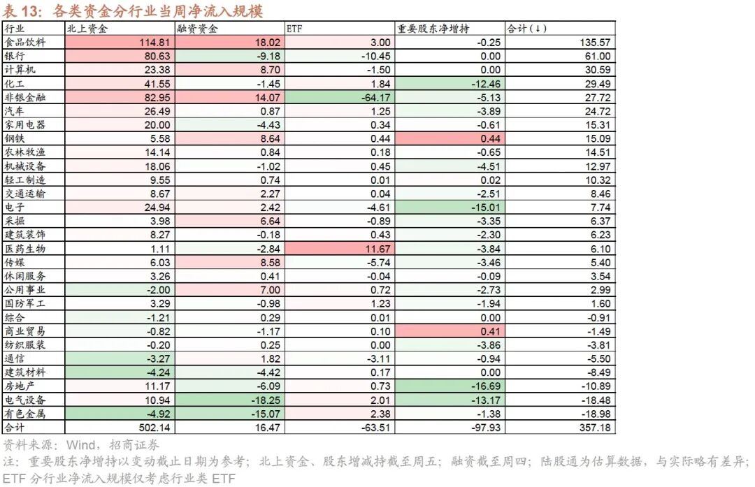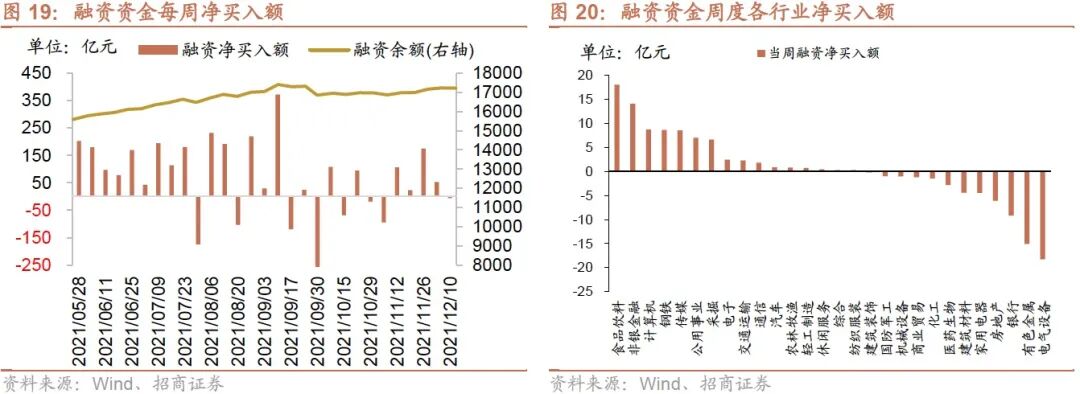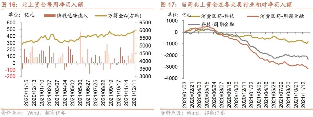 本周(12月5日-12月9日)北上资金净流入488.3亿元,相比前期上升。行业偏好上,北上资金净买入规模较高的为食品饮料、非银金融、银行等,分别净买入114.8亿元、83.0亿元、80.6亿元;集中卖出有色金属、建筑材料、通信等,净卖出规模达-4.9亿元、-4.2亿元、-3.3亿元。