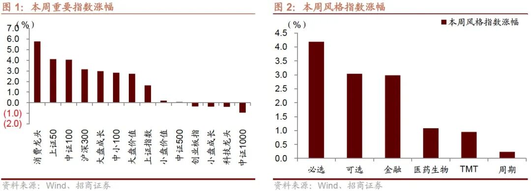 本周A股主要市场指数多数上涨,其中消费龙头、上证50、中证100涨幅居前,中证1000、科技龙头、小盘成长跌幅居前。从成交上来看,本周日均成交11896亿元,日均成交与上周相比有所放量。南向资金本周净流入港股144亿港币,北向资金本周大幅净流入A股488亿人民币。