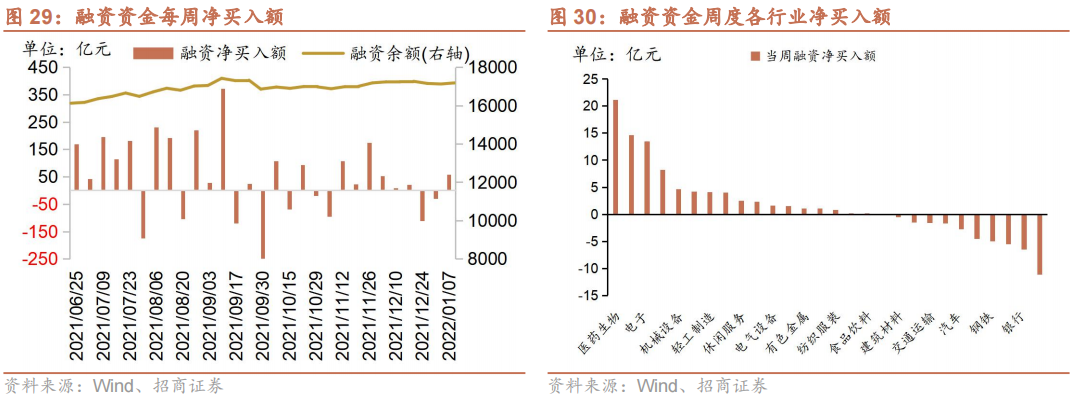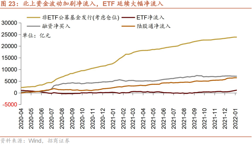 从全周资金流动的情况来看,本周北上资金波动较大,单日大进大出,当周净流入;融资资金转净流入,新成立偏股公募基金规模明显下降,ETF延续大幅净申购。具体来看,北上资金本周净流入62亿元;融资资金前四个交易日合计净流入58亿元;新成立偏股类公募基金36.8亿份,较前期下降,新年第一周新发基金不及预期;ETF延续净申购,对应净流入189亿元。