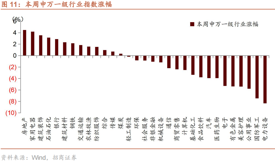 本周A股市场主要偏向中大盘风格,从行业风格上来看,本周申万一级行业整体多数下跌,行业指数中房地产、家电、建筑装饰涨幅居前,跌幅居前的行业分别有电力设备、国防军工、公用事业,从涨跌原因来看,本周涨幅第一的房地产行业主要在于稳增长预期以及估值修复需求,此外随着主赛道调整,短期而言低估值稳增长板块是阻力最小的方向。家电板块和建筑装饰板块等地产后周期板块本周跟随房地产上涨。跌幅居前的行业中,电力设备的大幅下跌主要由于新能源板块的大幅调整,主要由于部分投资者担忧增长压力,叠加投资者年初集中调仓,造成了股价波动。