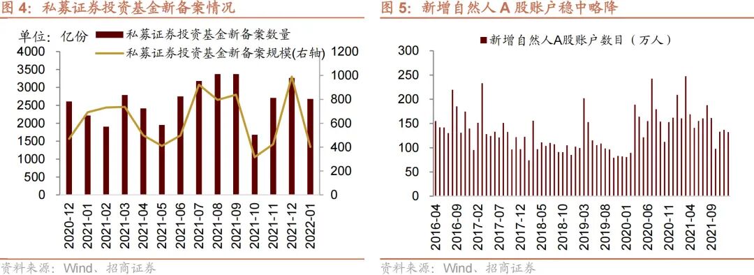 ⚑ 1月私募规模逆势扩张,个人投资者开户稳中略降。私募证券投资基金规模6.34万亿,相比前期继续增加2192.7亿元,同比增速达到45.61%,增速持续放缓。1月新备案私募证券投资基金2681只,对应规模401.21亿元,环比下降59.47%。但在1月市场大幅回撤背景下,证券私募管理规模的增明显高于证券私募新备案规模,由此可以推测,私募投资人可能在市场下跌后有追加投资的行为。1月新增自然人A股账户132.11万,相比前一个月的新增136.88万稳中略降,处于历史中等偏上水平,由此来看,在1月市场下跌过程中,个人投资者开户热情并没有明显下降。
