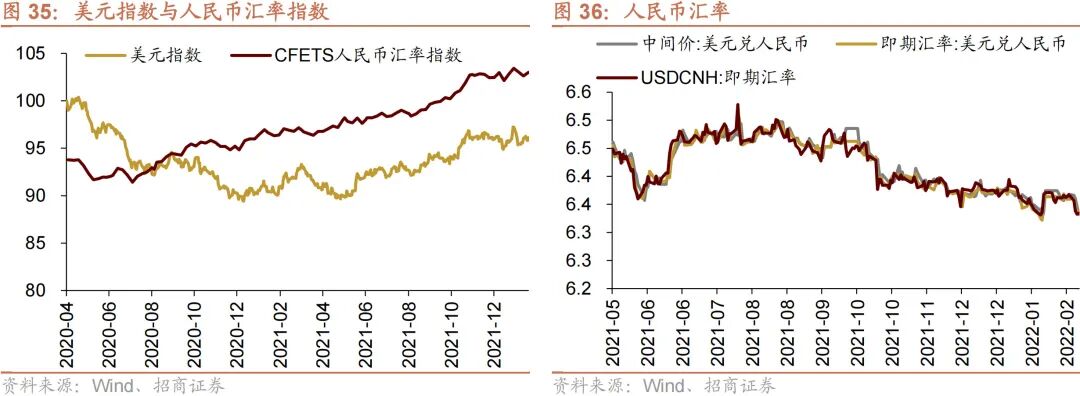 2月14日-2月18日,美元指数回升,人民币相对美元升值。截止2月18日,美元指数收于96.10,较前期(2月13日)上升0.07点,人民币汇率指数较前期上升0.4点收于103.0点,美元兑人民币中间价下降、即期汇率下降、离岸汇率下降,分别为6.33、6.33、6.33,人民币升值。