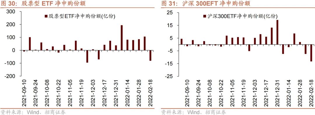 2月14日-2月18日,ETF净赎回,当周净赎回81.1亿份,宽指ETF均为净赎回,其中创业板(含创业板50)ETF赎回最多;行业ETF申赎参半,其中券商ETF申购较多,医药ETF赎回较多。具体的,沪深300ETF净赎回13.3亿份;创业板ETF净赎回14.2亿份;中证500ETF净赎回0.7亿份;上证50ETF净赎回0.4亿份。双创50ETF净赎回10.6亿份。行业方面,信息技术ETF净赎回3.2亿份;消费ETF净赎回6.4亿份;医药ETF净赎回28.1亿份;券商ETF净申购34.7亿份;金融地产ETF净申购0.3亿份;军工ETF净申购7.4亿份;原材料ETF净赎回0.7亿份;新能源&智能汽车ETF净赎回16.0亿份。