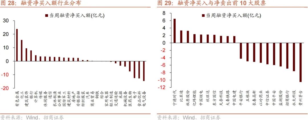 2月14日-2月18日,融资资金净流入19.3亿元。具体来看,本周融资资金买入有色金属(+23.8亿元)、化工(+15.7亿元)、建筑装饰(+9.6亿元)等行业,净卖出电气设备(-14.6亿元)、食品饮料(-12.7亿元)、电子(-12.5亿元)等行业。个股方面,融资净买入规模较高的为宁德时代(+6.5亿元)、比亚迪(+3.3亿元)、牧原股份(+3.3亿元)等;融资净卖出规模较高的包括贵州茅台(-10.5亿元)、永太科技(-7.6亿元)、招商银行(-6.9亿元)等。