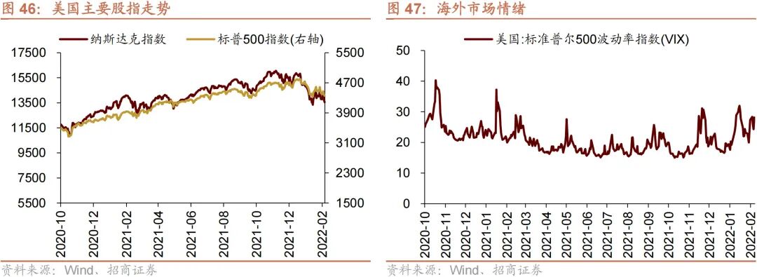 上周VIX指数回升,全周较前期(2月13日)上升0.39点至27.75,市场风险偏好下降。俄乌紧张局势继续打压市场情绪,上周标普500指数下跌1.76%,纳斯达克指数下跌1.58%。
