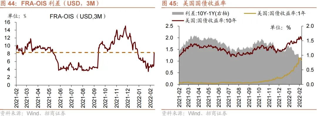 2月14日-2月18日,短端美债收益率上行,长端美债收益率与前期持平; FRA-OIS利差明显扩大。美国1年期国债收益率下行4.0bp至1.03%,10年期国债与前期持平,保持在1.92%,利差扩大4.0bp至0.89%,截止2月20日,FRA-OIS利差为11.1bp,较前期(2月13日)上升2.8bp,处于2010年以来的9.81%分位。