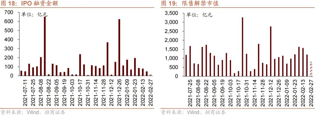 资金需求方面,2月14日-2月18日,IPO融资金额回落至46.0亿元,共有4家公司进行IPO发行,截至2月21日公告,未来一周将有2家公司进行IPO招股,计划募资规模12.0亿元。重要股东净减持规模扩大,净减持82.9亿元;公告的计划减持规模54.5亿元,较前期下降。