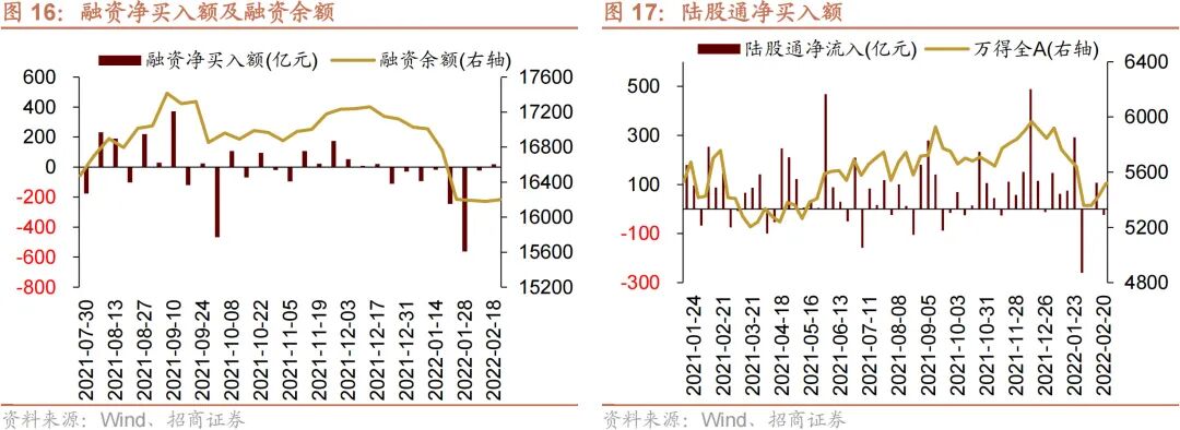 2月14日-2月18日,陆股通资金净流出24.0亿元。行业偏好上,电气设备、交通运输、银行这三个行业净买入规模较高,买入金额分别为22.6亿元、18.8亿元、14.6亿元。净卖出规模较高的行业是非银金融、电子、医药生物等行业。个股方面,净买入规模较高的主要包括汇川技术(+11.0亿元)、比亚迪(+8.1亿元)、中国中免(+7.6亿元)等;净卖出规模较高的主要包括迈瑞医疗(-10.1亿元)、合盛硅业(-9.5亿元)、亿纬锂能(-6.7亿元)等。