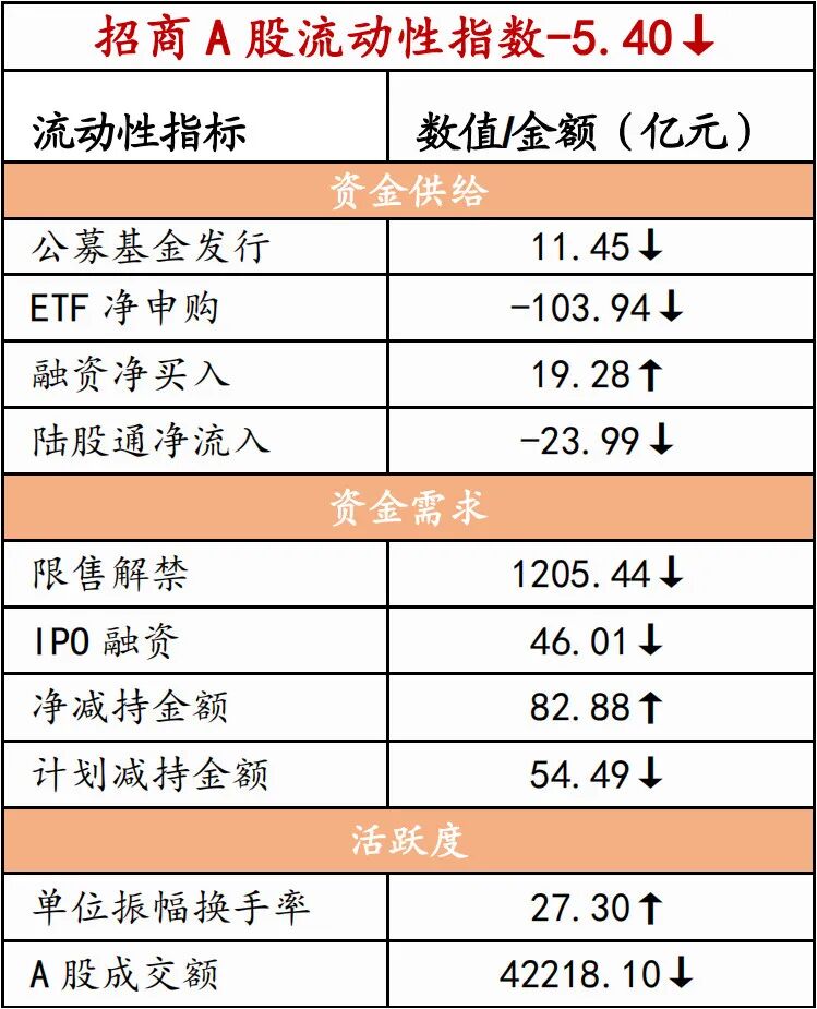 ⚑股市方面,A股市场流动性下降,招商A股流动性指数为-5.40。北上资金流出,净流出24.0亿元;融资余额上升,融资资金净买入19.3亿元;ETF净流出103.9亿元;新成立偏股类公募基金份额减少。重要股东净减持规模增加,公布的计划减持规模下降。