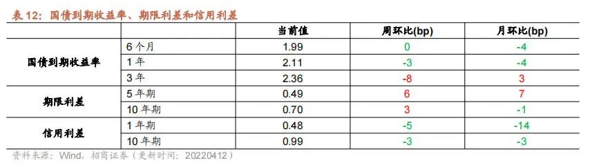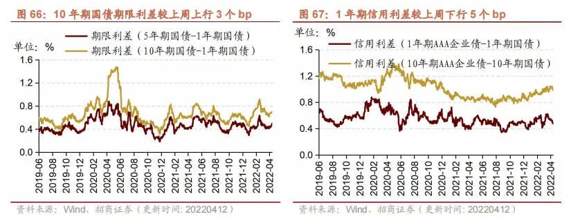 在债券收益率方面,6 个月国债到期收益率较上周持平,1 年/3 年国债到期收益率较上周下行。截至 4 月 12 日,6个月国债到期收益率较上周持平为 1.99%;1 年国债到期收益率较上周下行 3bp 至 2.11%,3 年期国债到期收益率较上周下行 4bp 至 2.36%。5 年期债券期限利差较上周上行 6bp 至 0.49%;10 年期债券期限利差较上周上行 3bp 至0.70%;1 年期 AAA 债券信用利差较上周下行 5bp 至 0.48%;10 年期 AAA 级债券信用利差较上周下行 3bp 至0.99%。