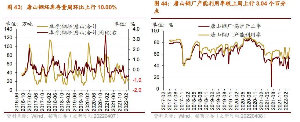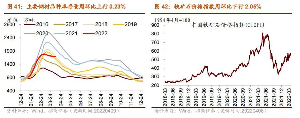 本周铁矿石、钢坯、螺纹钢价格下行;主要钢材品种、唐山钢坯库存上行,国内港口铁矿石库存下行;唐山钢厂高炉开工率上行,唐山钢厂产能利用率上行。产量方面,截至 3 月 31 日,重点企业粗钢日均产量为 216.01 万吨/天,旬环比上行 5.41%,全国粗钢预估日均产量为 278.75 万吨/天,旬环比上行 4.85%。价格方面,截至 4 月 13 日,螺纹钢价格为 5093.00 元/吨,周环比下行 1.45%;截至 4 月 12 日,钢坯价格 4808.0 元/吨,周环比下行 2.04%;截至4 月 12 日,铁矿石价格指数为 554.96,周环比下行 2.05%。库存方面,截至 4 月 7 日,国内港口铁矿石库存量为15227.00 万吨,周环比下行 1.06%;截至 4 月 7 日,唐山钢坯库存量为 27.50 万吨,周环比上行 10.00%;截至 4月 8 日,主要钢材品种库存周环比下行 0.23%至 1690.05 万吨。产能方面,截止 4 月 8 日,唐山钢厂高炉开工率54.76%,周环比上行 2.38%;唐山钢厂产能利用率 70.31%,较上周上行 3.04 个百分点。