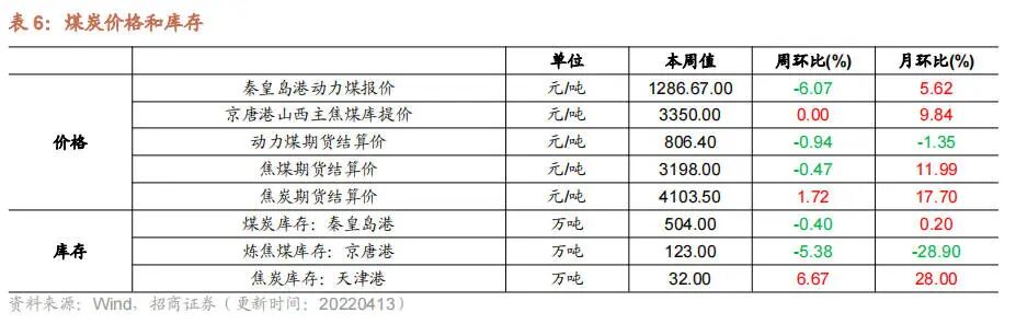 价格方面,秦皇岛港动力煤报价下行,京唐港山西主焦煤库提价与上周持平;焦煤、动力煤期货结算价下行,焦炭期货结算价上行。截至 4 月 12 日,秦皇岛港动力煤报价 1286.67 元/吨,较上周下行 6.07%;截至 4 月 12 日,京唐港山西主焦煤库提价 3350.00 元/吨,与上周持平。截至 4 月 13 日,焦炭期货结算价收于 4103.50 元/吨,周环比上行 1.72%;焦煤期货结算价收于 3198.00 元/吨,周环比下行 0.47%;动力煤期货结算价 802.40 元/吨,周环比下行0.94%。截至 4 月 7 日,南方八省电厂日耗 167.5 万吨,旬环比下行 11.38%。