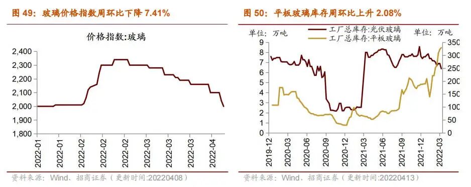 玻璃价格指数周环比下降。截至 4 月 13 日。玻璃价格周环比下降 7.41%。截至 4 月 8 日,光伏玻璃工厂总库存周环比下降 7.32%至 6.39 万吨,平板玻璃工厂库存总量周环比上行 2.08%至 329.6 万吨。