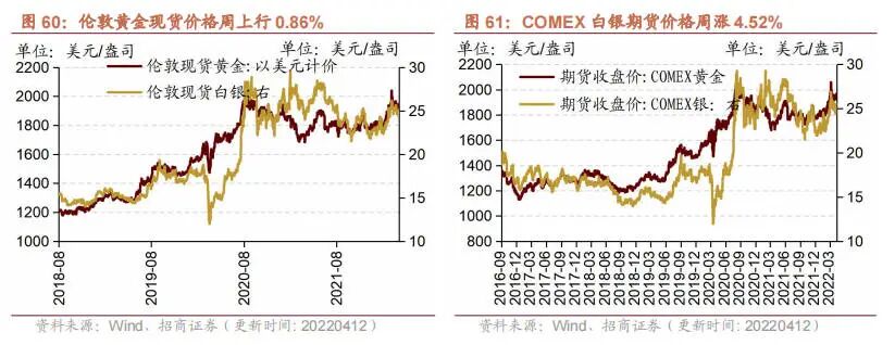 本周黄金、白银现货价格上涨。截至 4 月 12 日,伦敦黄金现货价格为 1960.85 美元/盎司,周环比上行 0.86%;伦敦白银现货价格收于 25.01 美元/盎司,较上周上行 1.34%;COMEX 黄金期货收盘价报 1970.30 美元/盎司,较上周上行 2.27%;COMEX 白银期货收盘价上行 4.52%至 25.56 美元/盎司。