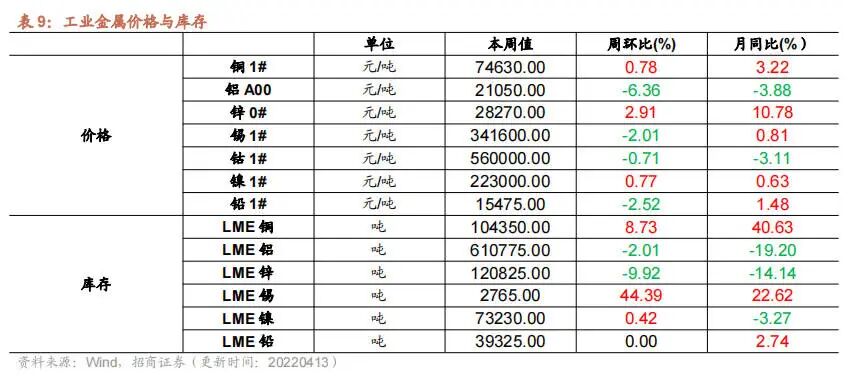 库存方面,截至 4 月 12 日,LME 锡库存周环比上行 44.39%至 2765.0 吨;LME 铅库存与本周持平为 39325.0 吨;LME 锌库存本周下行 9.92%至 120825.0 吨;LME 铝库存较上周下行 2.01%至 610775.0 吨;LME 铜库存较上周上行 8.73%至 104350.0 吨;LME 镍库存 72230.0 吨,较上周上行 0.42%。