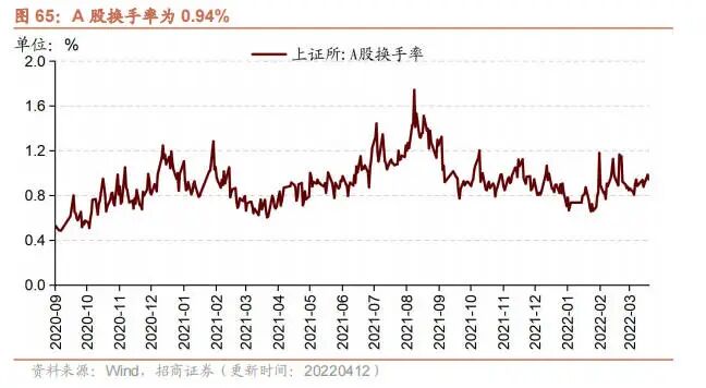 A 股换手率上行、日成交额下行。截至 4 月 12 日,上证 A 股换手率为 0.94%,较上周上行 0.06 个百分点;沪深两 市日总成交额下行,两市日成交总额为 8880.40 亿元人民币,较上周下行 1.94%