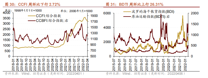 本周中国出口集装箱运价指数CCFI、中国沿海散货运价综合指数CCBFI下行。在国内航运方面,截至4月8日,中国出口集装箱运价综合指数CCFI周环比下行2.72%至3,117.75点;中国沿海散货运价综合指数CCBFI周环比下行1.31%至1,179.26点。本周波罗的海干散货指数BDI下行,原油运输指数BDTI上行。在国际航运方面,截至4月6日,波罗的海干散货指数BDI为2213.0点,较上周下行8.44%;原油运输指数BDTI为1469.0点,较上周上行26.31%。