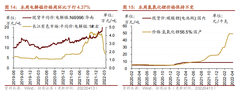 本周电解液、正极材料、部分锂材料、钴产品价格下行。在电解液方面,截至4月13日,电解液溶剂DMC价格维持在5800元/吨;六氟磷酸锂价格周环下行7.45%至43.50万元/吨。在正极材料方面,截至4月13日,电解镍Ni9996现货均价周环下行1.97%至219500元/吨;电解锰市场平均价格周环比下行4.37%至17500元/吨。在锂原材料方面,截至4月13日,氢氧化锂价格维持在491500元/吨;电解液锰酸锂价格周环比下行0.28%至7.03万元/吨;电解液磷酸铁锂价格周环比下行2.50%至9.75万元/吨;三元材料价格周环比下行0.27%至369.95元/千克;钴产品中,截至4月13日,钴粉价格维持在648元/千克;氧化钴价格周环比下行0.83%至416.5元/千克;四氧化三钴价格维持在441.0元/千克;电解钴价格周环比下行1.97%至546000.0元/吨。