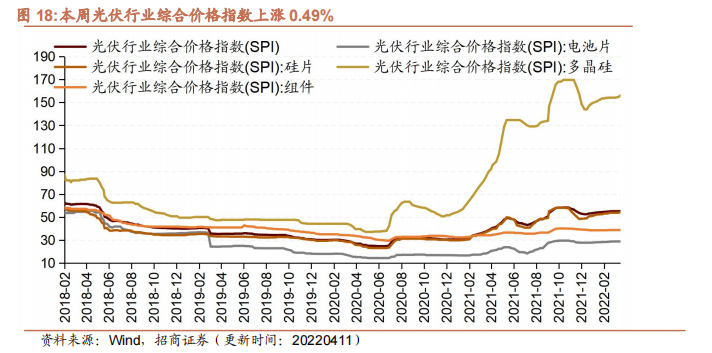本周光伏行业综合价格指数上行,硅片、多晶硅价格指数小幅上行,组件、电池片价格指数与上周持平。截至4月11日,光伏行业综合价格指数为55.52,较4月6日上升0.49%;组件价格指数为38.79,与上周持平;电池片价格指数为28.83,与上周持平。硅片价格指数为54.46,较4月6日上升1.15%;多晶硅价格指数为156.04,较4月6日上升0.80%;