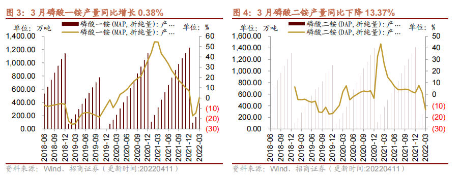 供给端,产能去化、停产检修叠加海外冲击导致磷化工供给短缺。国内来看由于环保和能耗原因,近年来我国磷铵和黄磷产能收缩。截至22年3月份,国内磷酸一铵、磷酸二铵、黄磷的有效产能分别为1893万吨/年、2205万吨/年、138.25万吨/年,相比2017年分别降低28.1%15.2%和1.5%,21年板块产量增速明显放缓。龙头企业凭借自身的规模优势具有较强的竞争力。4月7日,工业和信息化部、国家发展和改革委员会、科学技术部、生态环境、应急管理部、国家能源局六部委联合印发《关于“十四五”推动石化化工行业高质量发展的指导意见》,《意见》进一步提出严控磷铵、黄磷等行业的新增产能,加快落后产能的退出。短期维度,近期贵州企业大多暂停报价,湖南、湖北等地区进行安全检查;由于技术和产品验收周期等因素影响,今年释放的有效产能不及预期整体库存偏低。国际方面,今年2月份俄罗斯和乌克兰地缘政治冲突升级,由于俄罗斯和乌克兰均为农产品贸易大国,尤其俄罗斯是全球化肥供应大国,进一步加剧了国际粮食和化肥的短缺。