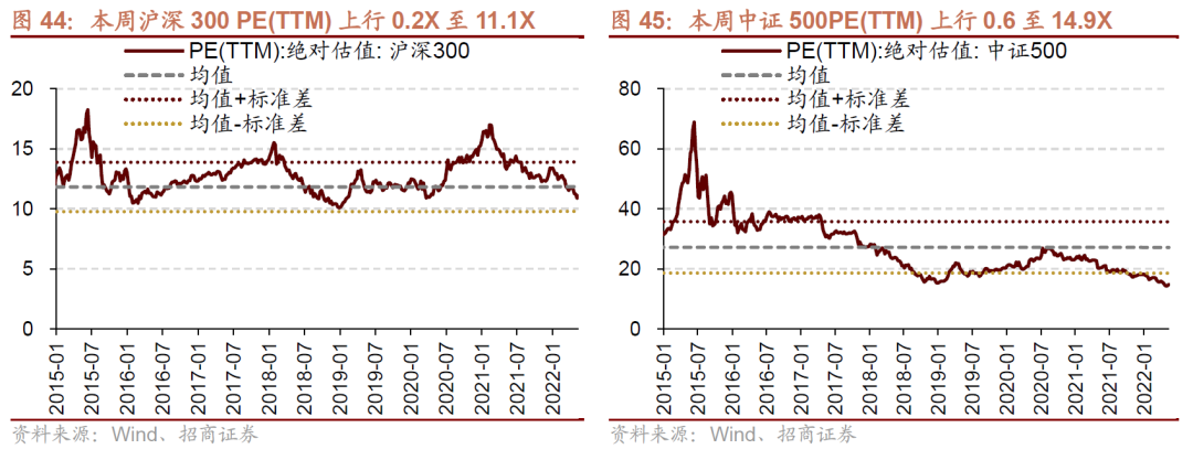 本周全部A股估值水平上行。截至5月13日收盘,全部A股PE(TTM)上行0.4X至13.5X,处于历史估值水平的29.3%分位数。创业板本周上行,PE(TTM)上行1.8X至36.2X,处于历史估值水平的14.0%分位数。代表大盘股的沪深300指数PE(TTM)本周上行0.2X至11.1X,处于历史估值水平的33.0%分位数。代表中小盘股的中证500指数PE(TTM)本周上行0.6至14.9X,处于历史估值水平的0.5%分位数。在行业估值方面,本周板块估值涨跌分化,其中,休闲服务板块估值上涨较多,涨幅超过2.5X。其中,休闲服务板板块上涨2.5X至47.1X,处于63.0%历史分位;采掘板块估值下跌0.1X至9.1X,处于0.0%历史分位。截至5月13日收盘,一级行业估值排名前五的行业分别是农林牧渔、社会服务、国防军工、美容护理、计算机。