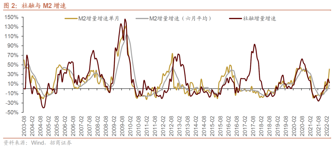 4月M2与社融背离,M2高增显示财政支出力度增大,积极为企业纾困和保障民生,大规模的留抵退税对于疫后企业生产经营的恢复将发挥积极作用。相比之下,社融数据下滑,很大程度受疫情冲击影响。目前,上海疫情已经出现实质性改善,复产复工也在积极推进,并将开始分阶段复商复市。随着疫情缓解,此前积累的国内新开工项目将会逐渐转换为施工高峰。多个城市推出一系列房地产放松政策,央行下调个人首套住房商贷利率下限,并鼓励各地在此基础上因城施策确定贷款利率加点下限,有利于房地产销售回暖。