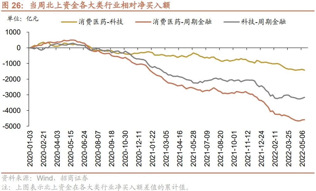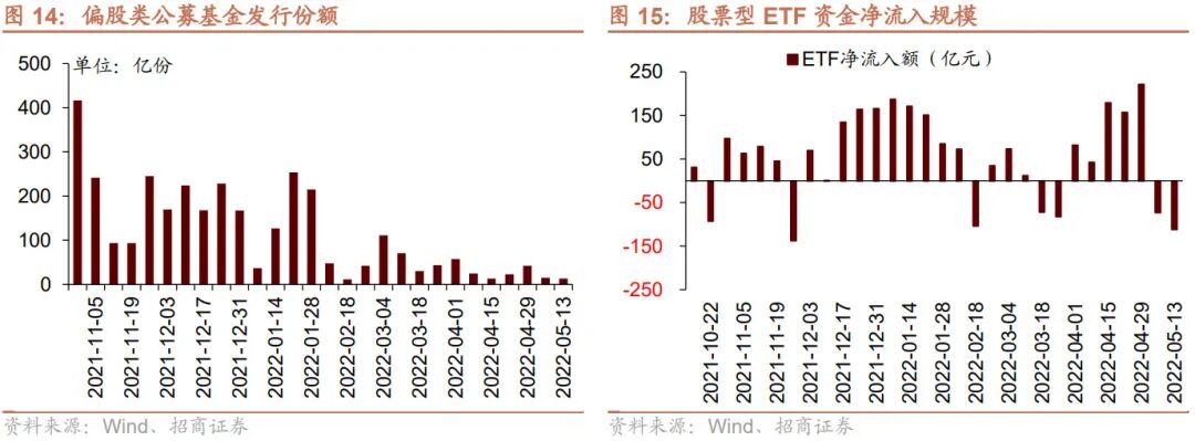 资金供给方面,5月9日-5月13日,新成立偏股类公募基金13.4亿份,较前期减少1.5亿份。股票型ETF较前期净流出,对应净流出111.5亿元。全周整个市场融资净买入49.4亿元,净买入额较前期收窄0.7亿元,截止5月13日,A股融资余额为14437.2亿元。陆股通本周净流出,当周净流出规模为73.2亿元,净卖出额较前期扩大49.6亿元。