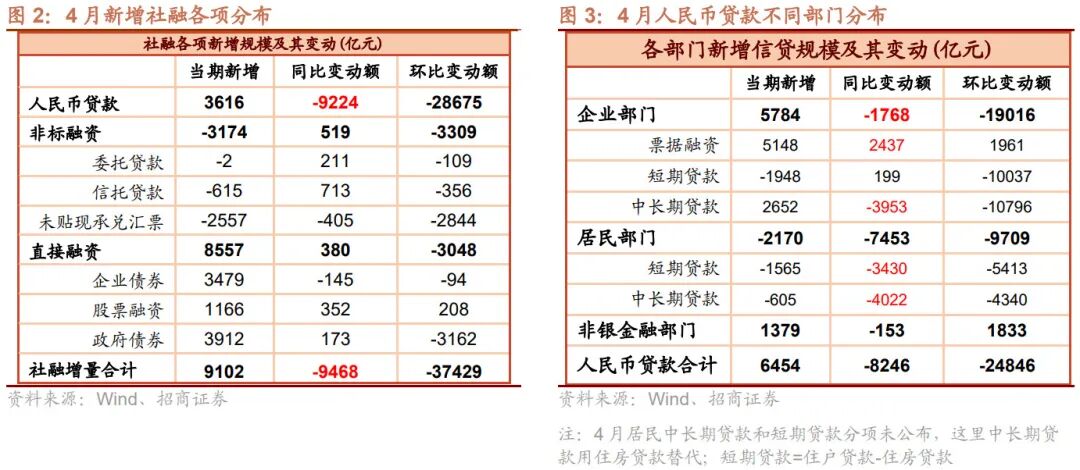 4月金融数据受疫情冲击,社融增量和增速如期下滑。具体来看, 4月新增社融9102亿元,同比少增9468亿元;新增人民币信贷6454亿元,同比少增8246亿元。社融存量增速10.2%,较前期下降0.4%;新增社融(6个月移动平均)增速回落至12.08%。