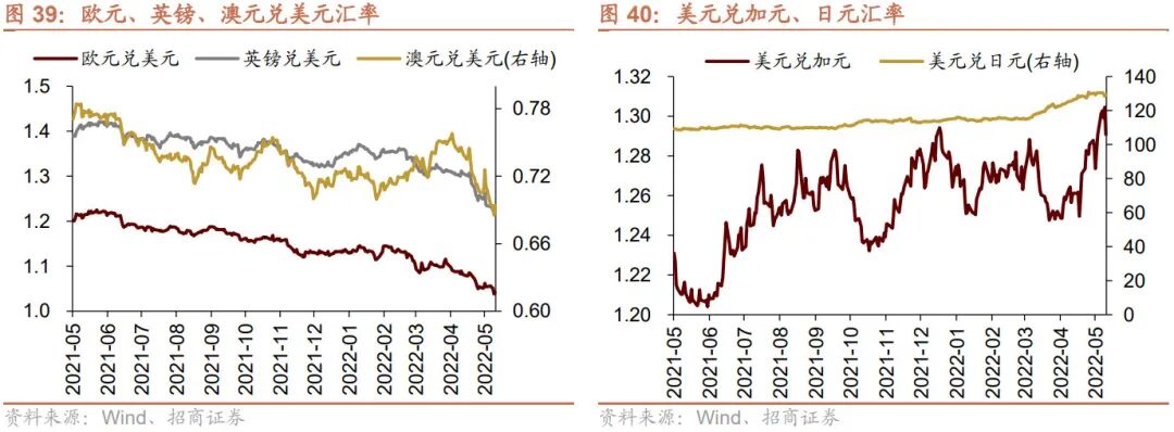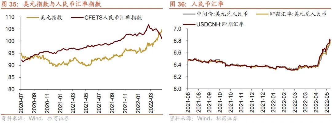 5月9日-5月13日,美元指数回升,人民币相对美元贬值。截止5月13日,美元指数收于104.45,较前期(5月8日)上升0.79点,人民币汇率指数较前期下降1.6点收于100.8点,美元兑人民币中间价上升、即期汇率上升、离岸汇率上升,分别为6.79、6.78、6.80,人民币贬值。