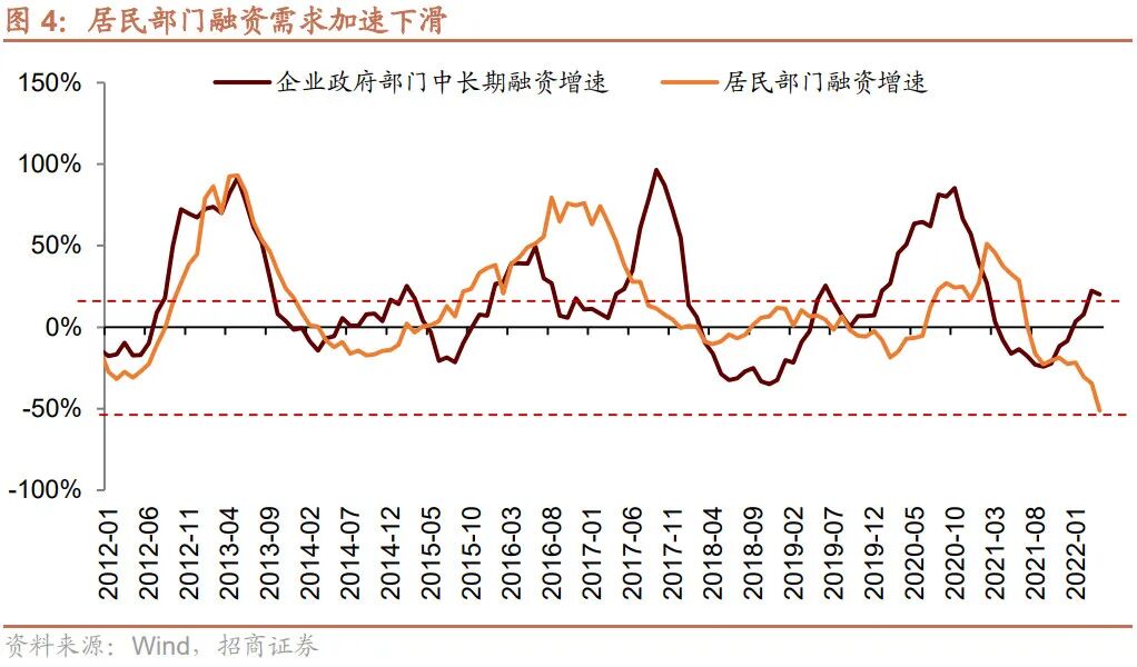 ⚑ 4月社融如期下滑,财政支出发力支撑M2高增。具体来看,4月疫情冲击加剧经济下行,新增社融同比少增9468亿元;新增人民币信贷同比少增8246亿元。社融存量增速较前期下降0.4%;新增社融(6个月移动平均)增速回落至12.08%。人民币贷款同比大幅少增,是社融下滑的主要来源。居民部门贷款全面收缩;企业部门短贷收缩,中长期贷款同比大幅少增。而财政支出力度增大,大规模留抵扣形成企业和居民存款,带动M2高增。未来随着疫情缓解,稳增长政策落地,有望带动融资需求逐渐回暖;另外近期全国多地因地制宜推出房地产放松政策,央行下调个人首套房商贷利率下限,将对居民部门融资需求的拉动发挥一定积极作用。