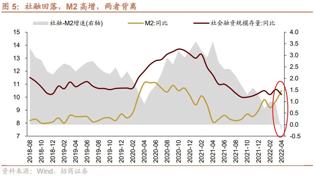 但相比于下滑的社融,M2实现高增。4月社融存量增速10.2%,较前期下降0.4%;M2同比增速10.5%,较前期提升0.8%。M1同比增速5.1%,较前期提升0.4%。在融资需求不足、社融低迷的情况下,货币为何能够实现高增?