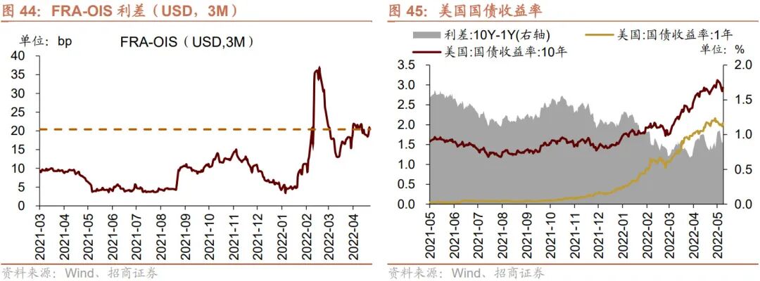 5月9日-5月13日,短、长端美债收益率下行,利差缩小,FRA-OIS利差扩大。美国1年期国债收益率下行4.0bp至2.04%,10年期国债收益率下行19.0bp至2.93%,利差缩小15.0bp至0.89%,截止5月15日,FRA-OIS利差为20.4bp,较前期(5月8日)下降1.2bp,处于2010年以来的58.27%分位。
