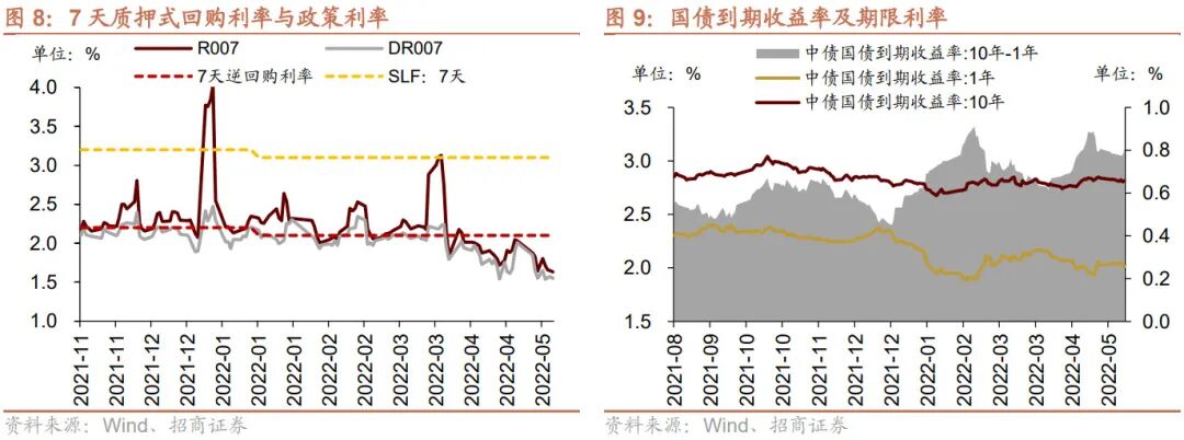 货币市场利率下行,R007与DR007利差缩小;短、长端国债收益率下行,期限利差扩大。截至5月13日,R007为1.63%,较前期下行1.2bp,DR007为1.55%,较前期下行0.1bp,两者利差缩小1.1bp至0.08%。1年期国债到期收益率下降3.0bp至2.01%,10年期国债到期收益率下降1.2bp至2.81%,期限利差扩大1.8bp至0.80%。