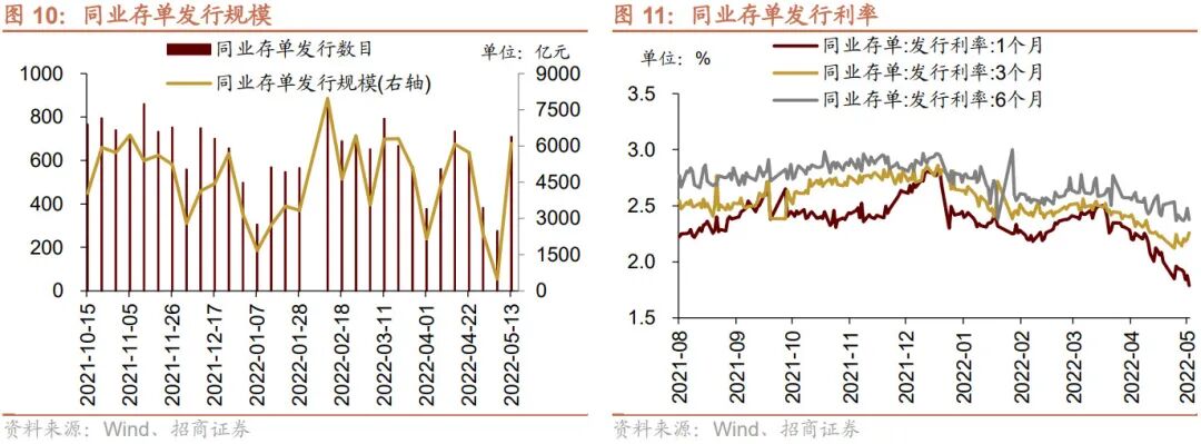 同业存单发行规模扩大,发行利率涨跌不一。5月9日-5月13日,同业存单发行710只,较上期增多434只;发行总规模6104.3亿元,较上期增多5615.0亿元;截至5月13日,1个月、3个月和6个月发行利率分别较前期变化-15.0bp、8.0bp、-4.0bp至1.79%、2.26%、2.38%。