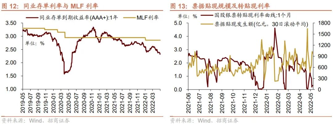 ⚑ 货币市场利率下行,短、长端国债收益率下行,同业存单发行规模扩大,发行利率涨跌不一。截至5月13日,R007下行1.2bp,DR007下行0.1bp,1年期国债收益率下行3.0bp,10年期国债收益率下行1.2bp,同业存单发行规模增加5615.0亿元,3M同业存单利率上行,1M/6M同业存单利率下行。