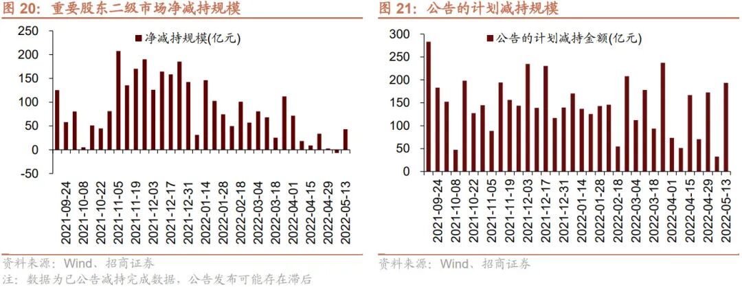 资金需求方面,5月9日-5月13日,IPO融资金额回升至34.6亿元,共有7家公司进行IPO发行,截至5月16日公告,未来一周将有3家公司进行IPO发行,计划募资规模56.2亿元。重要股东由净增持转为净减持,净减持43.3亿元;公告的计划减持规模193.7亿元,较前期上升。