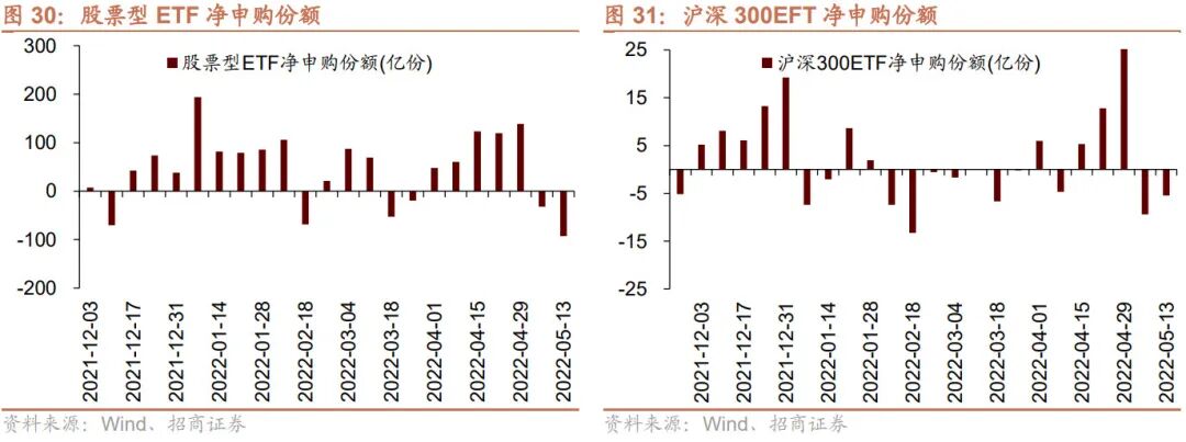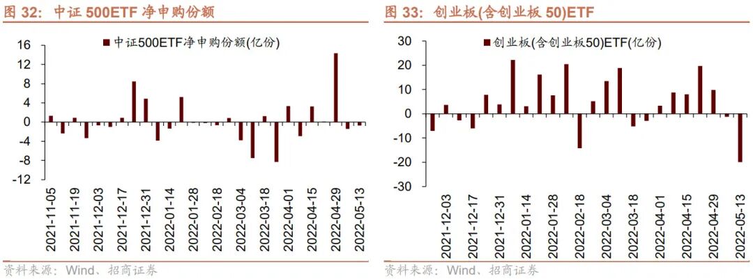 5月9日-5月13日,ETF净赎回,当周净赎回92.7亿份,宽指ETF均为净赎回,其中创业板(含创业板50)ETF赎回最多;行业ETF以净赎回为主,其中医药ETF赎回较多,金融地产(不含券商)ETF申购较多。具体的,沪深300ETF净赎回5.4亿份;创业板ETF净赎回19.9亿份;中证500ETF净赎回0.7亿份;上证50ETF净赎回2.6亿份。双创50ETF净赎回8.4亿份。行业方面,信息技术ETF净赎回12.4亿份;消费ETF净申购0.6亿份;医药ETF净赎回12.6亿份;券商ETF净赎回8.8亿份;金融地产ETF净申购0.9亿份;军工ETF净赎回4.0亿份;原材料ETF净赎回1.7亿份;新能源&智能汽车ETF净赎回5.3亿份。
