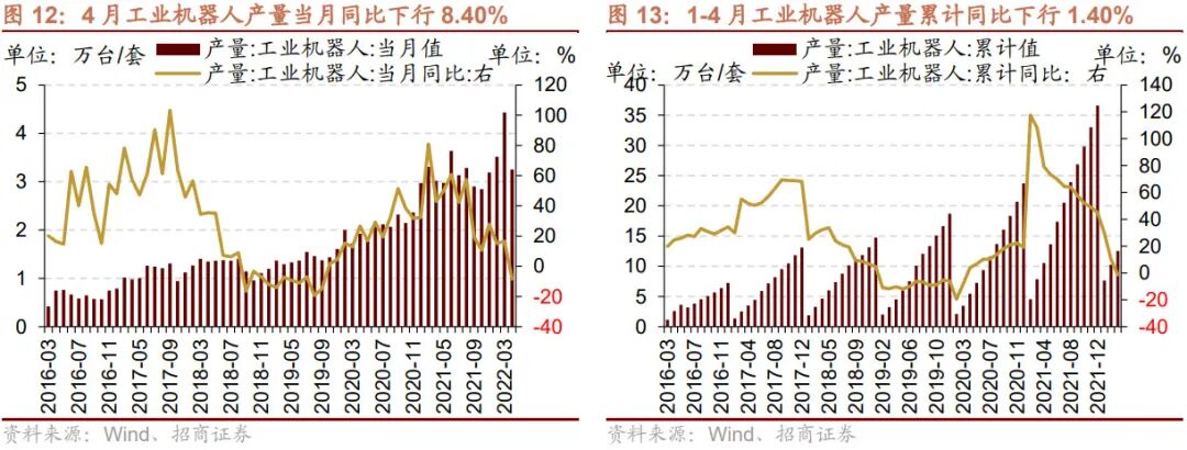 4月份工业机器人产量当月同比由正转负。4月工业机器人当月产量为32535台/套,当月同比下行8.40%,增幅较3月由正转负。2022年1-4月工业机器人累计产量为125439台/套,同比下行1.40%,增速由1-3月的10.2%转负。