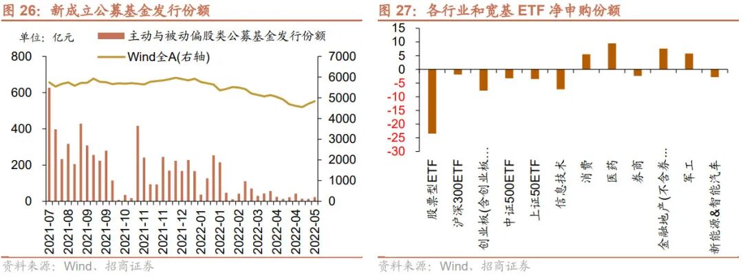 从ETF净申购来看,ETF净赎回,宽指ETF均为净赎回,其中创业板(含创业板50)ETF赎回最多;行业ETF申赎参半,其中医药ETF申购较多,信息技术ETF赎回较多。具体来看,股票型ETF总体净赎回23.5亿份。其中,沪深300、创业板ETF、中证500ETF、上证50ETF和双创50ETF分别净赎回1.9亿份、净赎回7.8亿份、净赎回3.3亿份、净赎回3.5亿份、净赎回2.8亿份。行业方面,信息技术ETF净赎回7.3亿份;消费ETF净申购5.5亿份;医药ETF净申购9.5亿份;券商ETF净赎回2.4亿份;金融地产ETF净申购7.6亿份;军工ETF净申购5.8亿份;原材料ETF净赎回0.4亿份;新能源&智能汽车ETF净赎回2.9亿份。